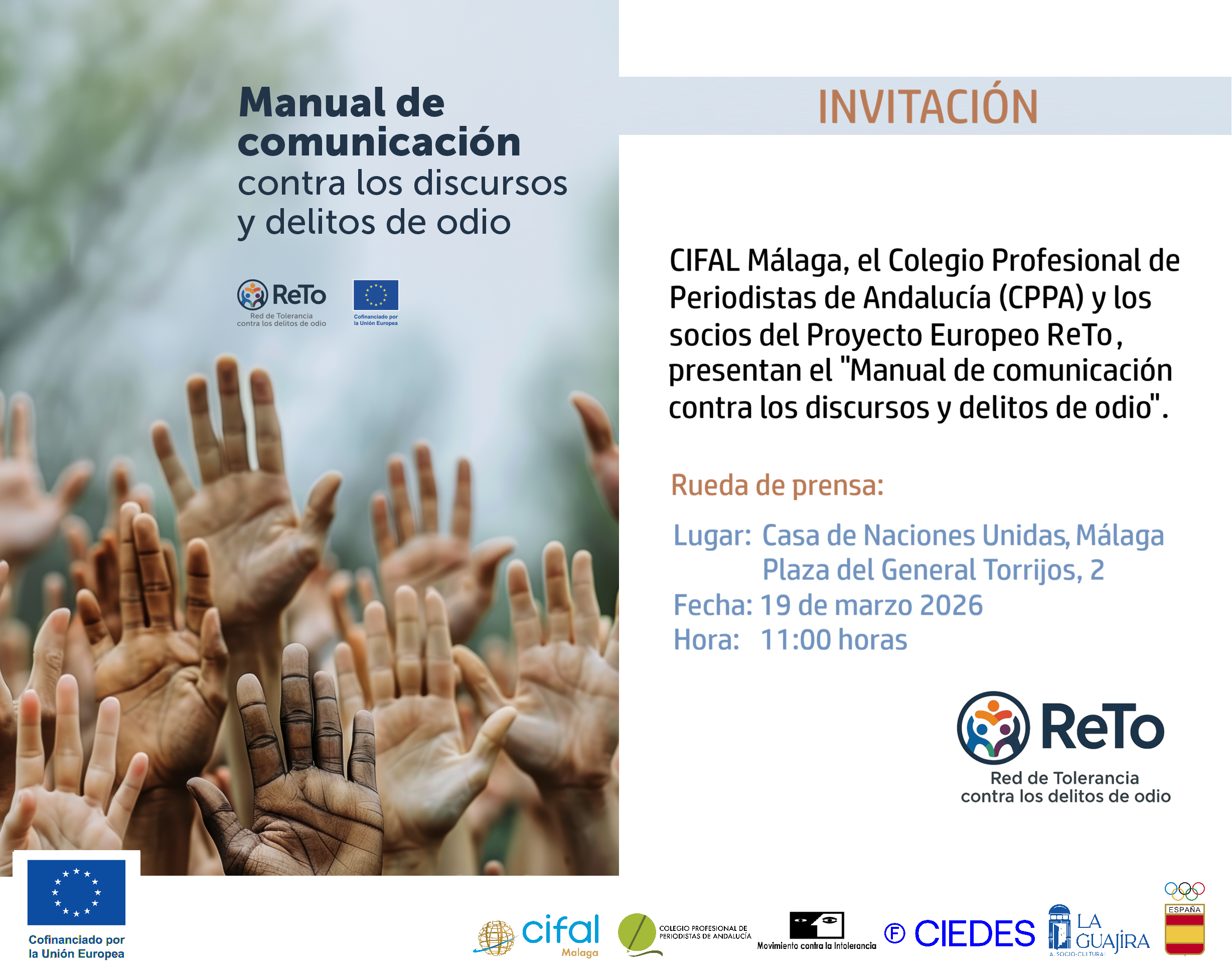 La ciudad de Málaga acogerá la presentación del Manual de comunicación contra los discursos y delitos de odio, una iniciativa impulsada por CIFAL Málaga, el Colegio Profesional de Periodistas de Andalucía (CPPA) y los socios del proyecto europeo ReTo – Red de Tolerancia contra los delitos de odio.